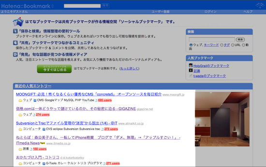 毎日欠かさずチェックするサイトとしてはてなブックマークがあるのですが、11月25日からリニューアルすると言う事で、このほどベータ版が公開されましたので早速使ってみて感想などを。まず、デザインが前のバージョンより素敵になっています。僕はこっちの方が好きですね。あと、各所でも話題になっておりますが自分のブックマークを簡単便利に検索できるのはとっても使いやすい!基本的にブックマークは「いつか使い時の情報としてブックマークする」事が多いのですが、その使う時になって、「どのタグだったっけ?」っと 探す事が多かったのですが、検索機能があれば単語だけで目的の物を見つける事ができます。そして、逆に新バージョンになって気になる所もそれは、一番良く目にする最新の人気エントリーのページですが、旧バージョンではページのタイトルのみで一覧でさっと見れたのですが、新しいバージョンではタイトル+ページの概要が表示されている為、僕にとっては可読性が良くない。