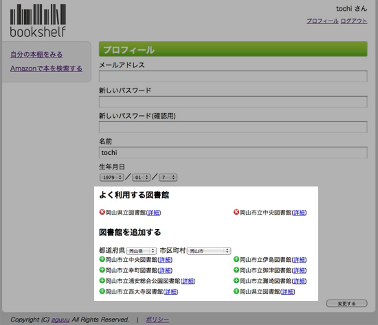 10 April 2010 bookshelfを図書館蔵書検索のカーリルに対応してみた 「bookshelf」を少し前に公開された図書館蔵書検索サイトの「カーリル」に対応してみました。 使い方は、まずプロフィールでよく利用する図書館を登録する。 あとは、自分で登録した本を表示すると下のほうに利用する図書館の貸出状況を表示しています。 裏でグルグル回しているので、かなりモッサリしていますがオイオイ調整していきます。 ご利用は下記からどうぞ。 持っている本を管理する bookshelf