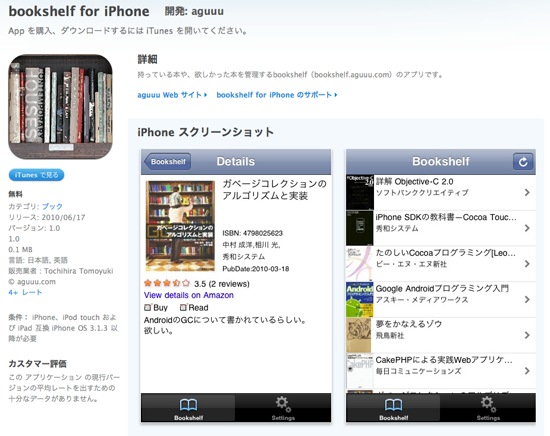 17 June 2010 bookshelf for iPhoneが公開されました。 ということでbookshelfのiPhoneアプリを公開しました。 機能的には想定していた殆どの機能を実装していません。w ただただ、bookshelfの情報を表示するのみです。 今回の収穫は、App Storeの審査が通るくらいにobjective-cが習得出来た事ですかね。 長い道のりでした。